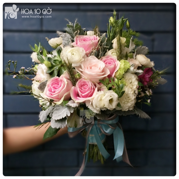 Những bông hồng công chúa ngọt ngào, bông hồng trắng tinh khôi điểm xuyết lan cát tường mềm mại nói lên tất cả vẻ đẹp của những cô dâu chọn bó hoa này. Ngoài ra, bó hoa còn có những chùm hoa Mimoza lãng mạn như tình yêu đôi lứa, những bông lúa mạch như nét thùy mị, nết na và đảm đang của người con gái đối với gia đình bé nhỏ.